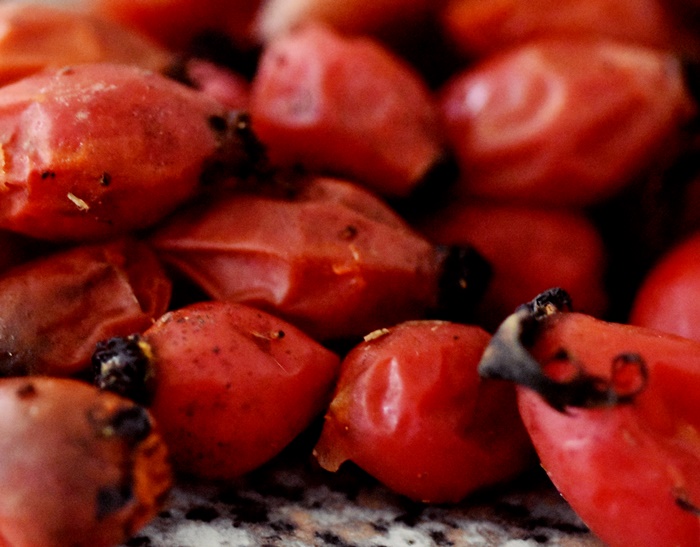 Wash the rosehips thoroughly and place in a pot with just enough water to cover them. Bring to a low boil and simmer for 15 mins. Then using a fork or a masher, mash them until the pulp and seeds are separated from the skin.