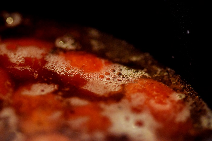 Bring back to a boil and simmer until it becomes of syrupy consistency and sticks on the back of a spoon. Adjust sweetness and acidity at this point.