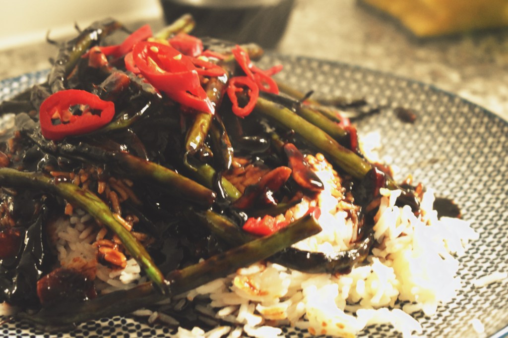 After the beans have charred, add the chopped up garlic and ginger and fry for 30-40 seconds. Add the sliced mushrooms, soy sauce and some sugar if you want it. Cook everything together until the sauce thickens (or help it a bit with some rice flour) an serve over rice, garnished with the sesame oil and chopped up chillies.