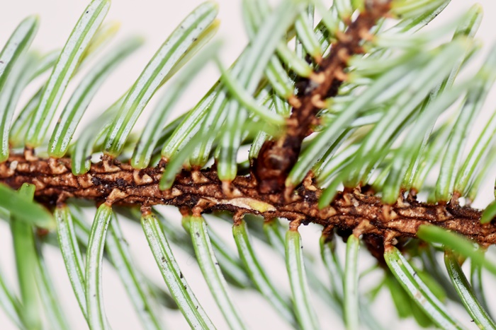 - Fir needles are flatter, they have a distinctive green midrib under the needle enclosed by two parallel silver lines, the needles are attached on the main branch though suction cups and the needles can’t be rolled between your fingers.