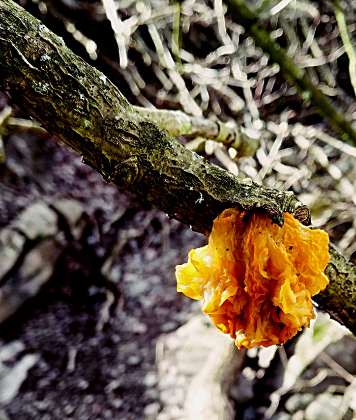 First things first- etymology. The name Tremella mesenterica comes from the Latin Tremella which means to tremble, and the Greek mesenterica which means medium intestine. So trembling medium intestine, how’s that for a descriptive name?